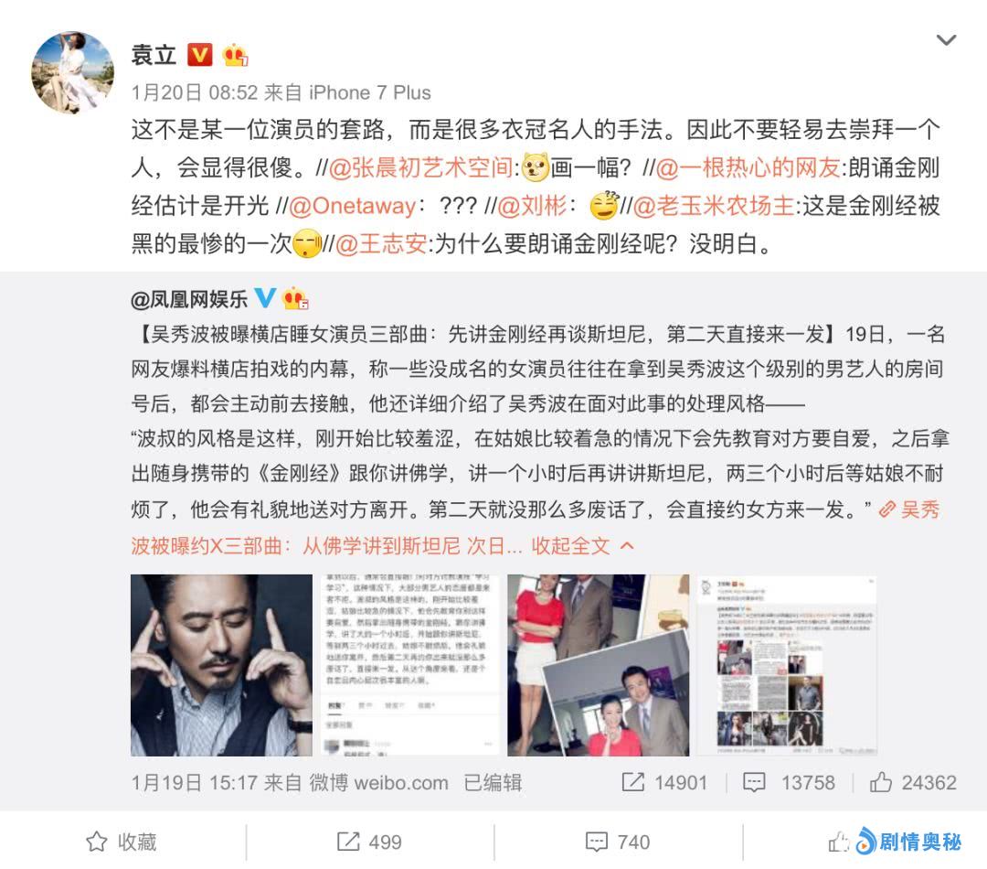 ——网友爆料横店拍戏内幕:一些没成名的女演员在拿到吴秀波这个级别男艺人的房间号后,都会主动前去接触,而吴秀波的处理风格是这样的——先教育对方要自爱,之后拿出随身携带的《金刚经》跟你讲佛学,接着再讲斯坦尼,两三个小时后等姑娘不耐烦了,他会有礼貌地送对方离开。第二天就没那么多废话了,会直接约女方来一发。1月20日,袁立转发了这条消息并如是说。