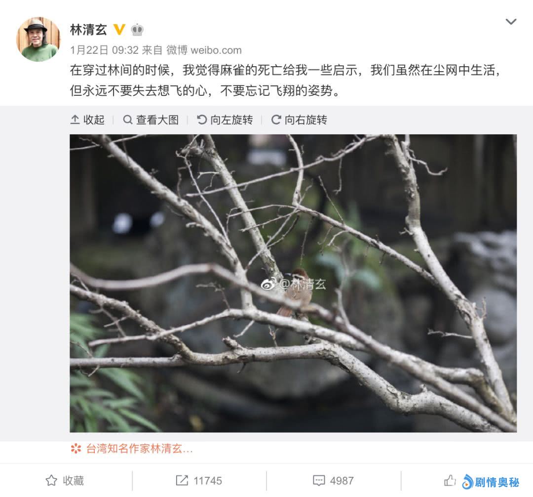 ——1月23日,台湾知名作家林清玄去世,享年65岁。而在此前一天(1月22日)9点32分,他还发了一条微博。文字间有他一如既往的禅意。