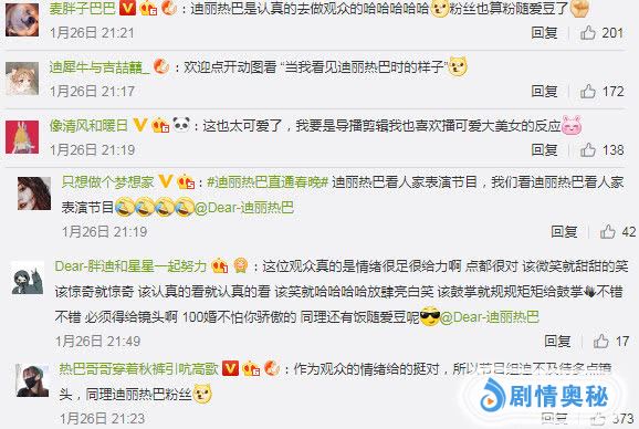 “作为观众的情绪给的挺对,所以节目组迫不及待多点镜头,迪丽热巴是认真的去做观众的。”对于爱豆在节目里的表现,爱丽丝们也调侃道要粉随爱豆,把“观众”迪丽热巴当作好榜样,好好学习。同时也感谢节目组对她的善良,如此魔性的镜头也就只有他们有材料了。一般人还找不到呢。剪辑师必须加鸡腿~