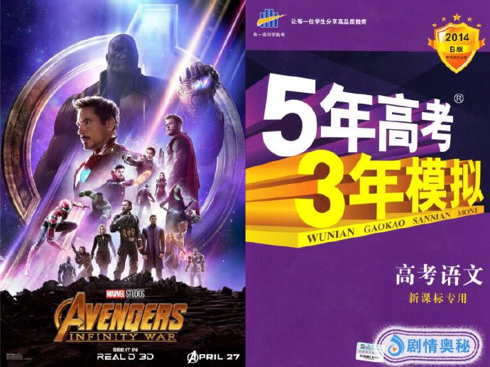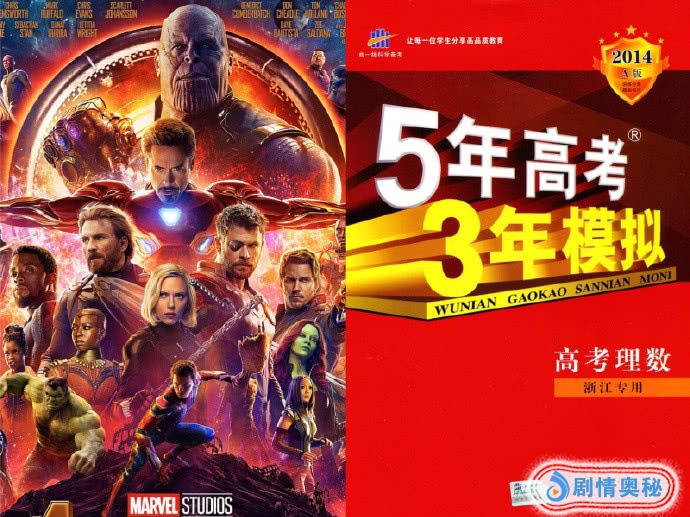 有网友在回顾漫威超英系列电影的海报时,发现了一个秘密!漫威的系列海报竟然都能和“折磨”过万千青少年的《5年高考3年模拟》的封面对上,一点违和感都没有!怪不得,看这两年的漫威电影的海报,莫名都有一种熟悉的感觉。