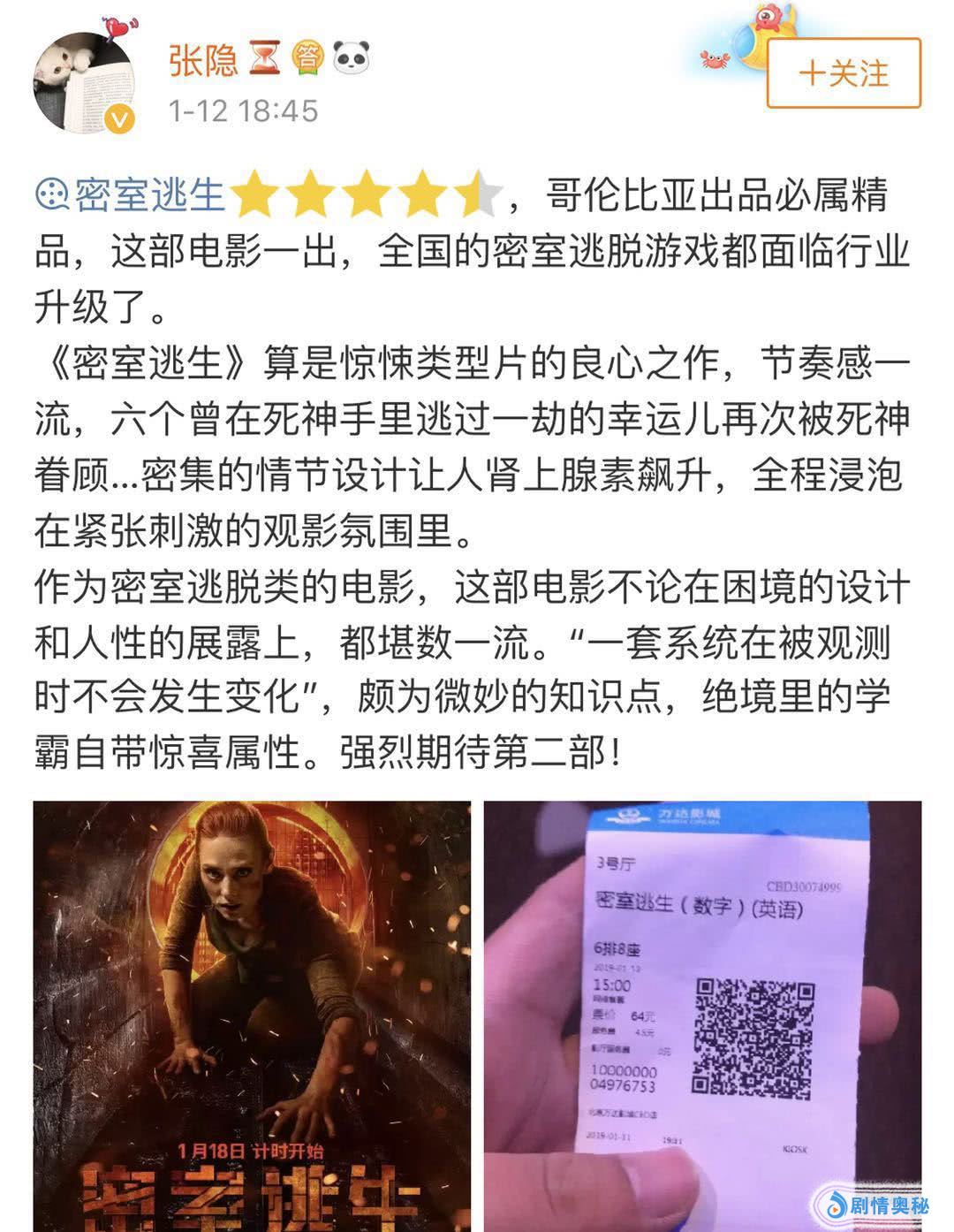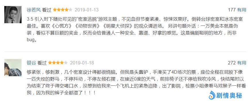 有人表示观影过程非常刺激:“让你心跳加速这件事《密室逃生》绝对比男票干的好。”“让你汗水湿透衣背的好片,还要二刷。”“这种从头紧张到尾的感觉我还只在《釜山行》感受到过!”有人对密室设计赞不绝口:“六大密室的设计太赞了,又想体验又害怕!”“资深密室爱好者也被密室关卡吓尿在影院!”