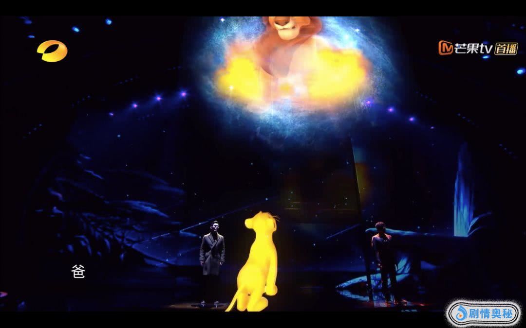 在纱幕、全息投影裸眼3D的助力下,《狮子王》中充满原始丛林气息的世界仿佛在演播室重现,观众也随着动画视频的场景变化,沉浸在贪婪的刀疤与三只土狼的阴谋之中、还有木法沙和小辛巴父子生死离别里,不仅是“声”临其境,更是“身”临其境。