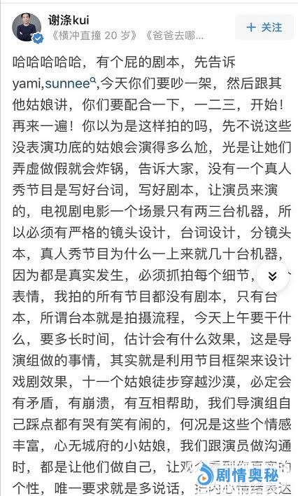 综艺大多都有剧本,所以很多观众其实怀孕这次吵架是不是按照剧本在演。《横冲直撞20岁》的总导演谢涤葵,也是在知乎上自曝该节目没有剧本,火箭少女在节目中的表现都是她们最真挚的表达。