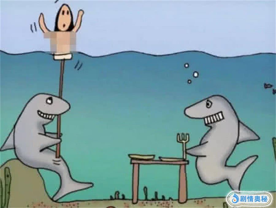 第二张:我们从图片中看到,海底是两个鲨鱼,他们都在等待自己的美食上桌,而另一个鲨鱼则举着一个穿着制服的人偶在水平面上,而这点也能看出,只要是被美女诱惑了,很容易上当。因此在现实生活中也有这样的事情。