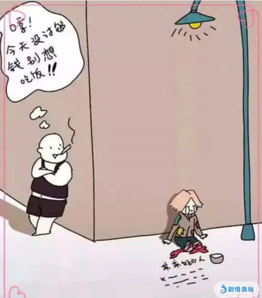 第三张:我们看到,一个没有双腿的小孩正在乞讨,而旁边则站着一个男子,这名男子还说没有乞讨够就不能吃饭,而当时看到这个小孩很可怜,任谁都会去给上点的。因此我们从这单看出,并不是所有的人都你想象中的目标,有的时候,乞讨不一定就会成功。