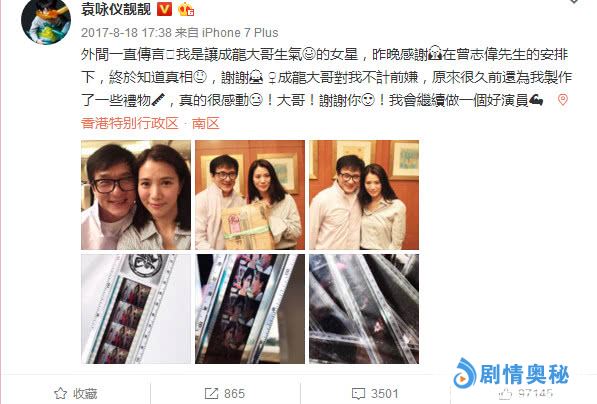 此前袁咏仪在微博中晒出与成龙同框照,并表示终于知道传言自己是让成龙大哥生气的女星和事情的真相,还感谢曾志伟做中间人,让两人冰释前嫌。