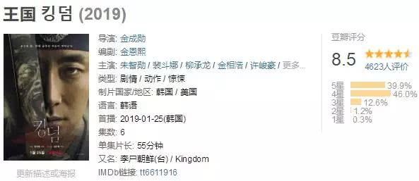 《王国》由朱智勋、裴斗娜、柳承龙等主演,演员阵容十分强大。它共计6集,刚开播便在豆瓣拿下了8.5分,作为一部丧尸题材剧集,显然是不错的口碑成绩。