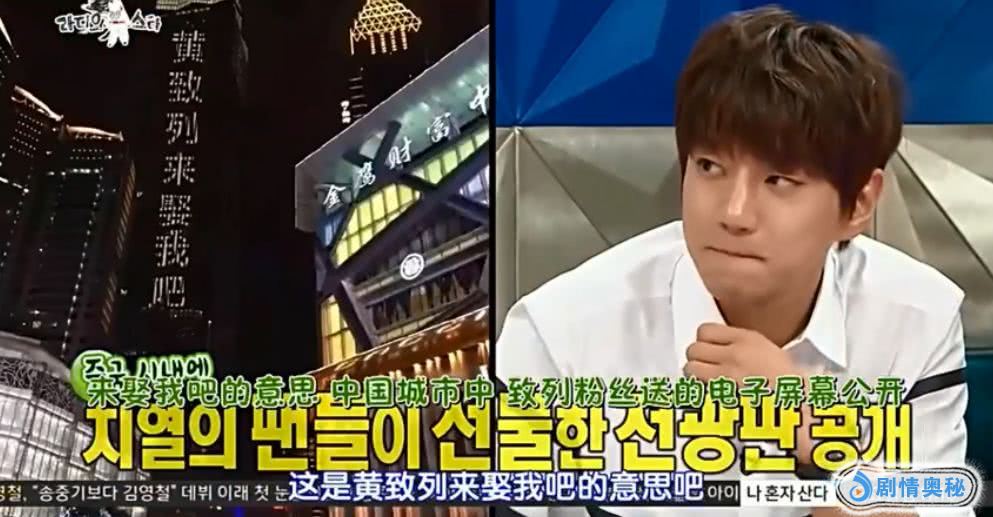 主持人放出一张粉丝在电子巨幕上表白黄致列的图片,黄致列含含糊糊地回答,据说是在上海。