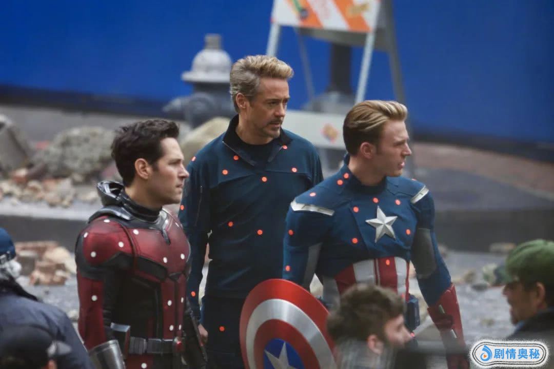 请熟记这张同框片场照:穿着现阶段战衣的蚁人,老态尽显的钢铁侠,以及穿着《美队1》战服的美队。