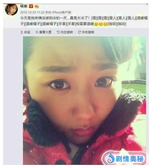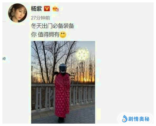 杨紫甚至还特意在微博给了这件心爱的羽绒服一席之地,直言这是她的心头之好,还号召大家值得拥有。等粉丝们都看上了的时候,她又恢复了邻家女孩的调皮,直言这可是她的独家定制,六年来可就靠它御寒了。