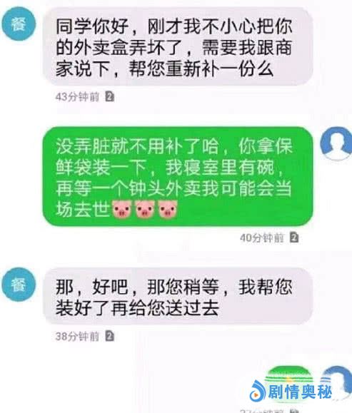 最近看到一位网友在某职场论坛发帖说了她点外卖的一次经历,这位网友说,当时她点了一份外卖,等了好半天收到了外卖小哥发来的信息,信息上小哥说他不小心把外卖盒弄坏了,问需不需要让商家重新补一份?网友回复说没弄脏就不用补了,让小哥拿保鲜袋装一下送去就可以了,再等一个小时的话,可能就被饿死了。