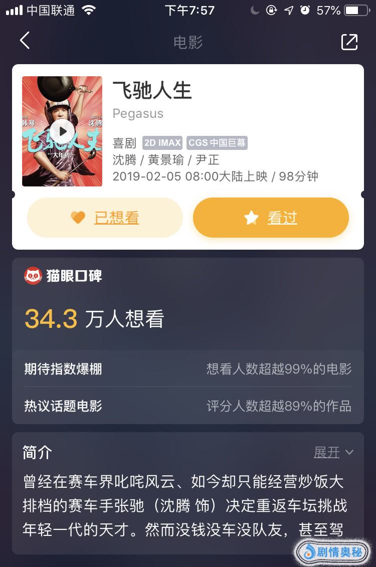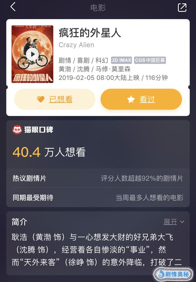 据猫眼专业版数据显示,《疯狂的外星人》想看人数达到40.4万,成当周最多人想看的电影,《飞驰人生》达34.2万想看人数,期待指数爆棚,想看人数超越99%的电影,而这两部电影都是由沈腾主演。