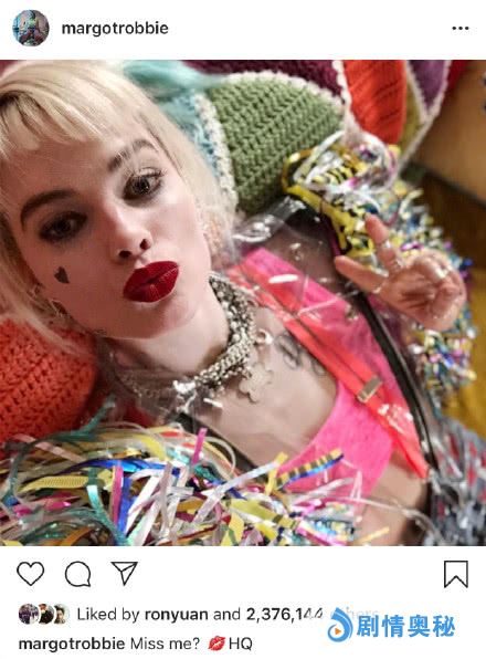 此前“小丑女”玛歌特·罗比在ins上分享了一张“小丑女”自拍照,以新造型露面,烈焰红唇做献吻状,同时还留言“想我了吗?”粉丝们在评论里“疯狂”表达思念,当然早已按奈不住激动的心情,要再见到“小丑女”。