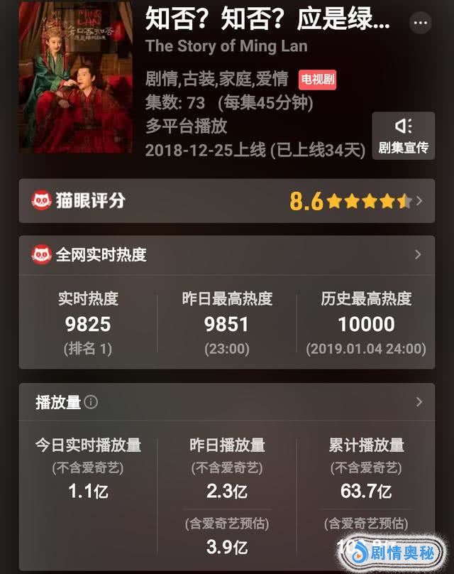 《知否》是一部从2018年跨越到2019年的新剧,从《大江大河》完结后,《知否》就开始一发不可收拾,不仅在收视率上一跃登顶,更是在网播量一度突破了100亿,成为了年度最新破100亿的新剧。而除了收视率,播放量获得不菲成绩之外,该片的口碑也依旧保持良好状态,虽然剧情长达73集,但是对于想一追到底的剧迷来说,恨不得多追加几集,过足瘾。