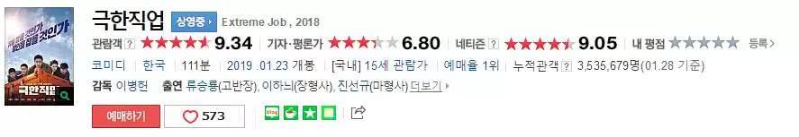 口碑方面,《极限职业》也表现极佳,在Naver平台,韩国观众打出了9.3的高分。
