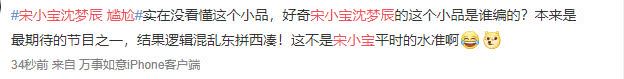 除此之外,沈梦辰还和宋小宝合作了小品《假戏真做》,宋小宝还是一如既往长在观众的笑点上。
