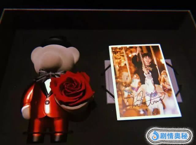 小凯弟弟送出的。最夺目的该是穿红色西装的小熊了。小熊手里还有一朵永生花。整体给人的感觉非常好。礼盒中还有女生爱用的粉底口红甚至是墨镜。看来在送礼之前,小凯弟弟的团队还是有做过细致的功课的。