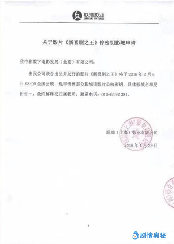 而在贺岁档如火如荼展开之际,1月29日晚,网上传出了一份《关于影片停密钥影城申请》的文件,该文件中可以明显的看出,发文方是联瑞(上海)影业有限公司,而接受方是中影数字电影发展(北京)有限公司。根据函中内容,可以清晰的得知,由于不满各大影院的排片场次,《新喜剧之王》将停止向527个影厅(涉及70余家电影院)授予影片上映密钥。这意味着,一旦申请成功,从大年初一开始,这些影院将不得放映《新喜剧之王》。