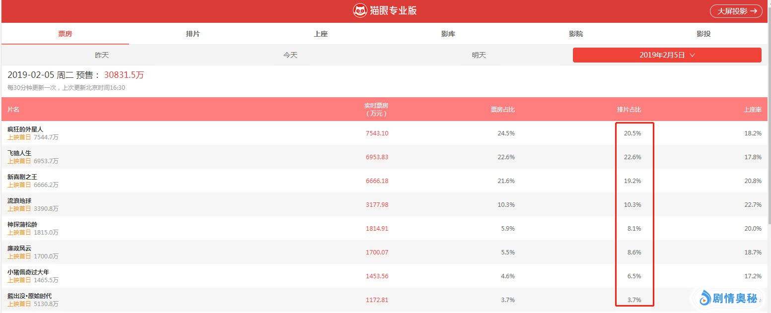 截止发文时间,在2019年春节档上映的影片包括《飞驰人生》《疯狂的外星人》《新喜剧之王》《流浪地球》等多部影片预售情况如下:根据猫眼专业版实时票房数据显示,影片《飞驰人生》排片率22,6%领先,《疯狂的外星人》排片率20.5%,第二,随后是《新喜剧之王》19.2%,第四的是《流浪地球》10.3%,而《神探蒲松龄》《廉政风云》等其他影片则将分食剩下不足30%的份额。