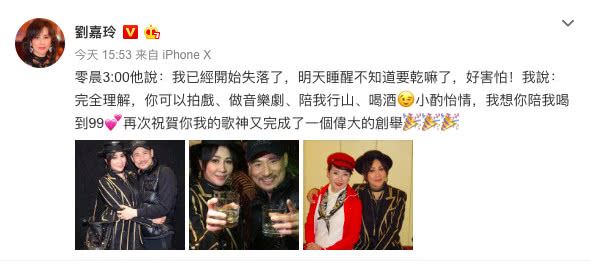 1月29日晚,历时2年3个月的张学友世界巡回演唱会在香港红馆圆满收官,这最后一场演唱会是本次巡演的第233场。刘嘉玲今日在微博晒出与张学友的合影,共举杯庆祝巡演结束并发文称,“零晨3:00他说:我已经开始失落了,明天睡醒不知道要干嘛了,好害怕!我说:完全理解,你可以拍戏、做音乐剧、陪我行山、喝酒小酌怡情,我想你陪我喝到99,再次祝贺你我的歌神又完成了一个伟大的创举。”