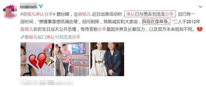 据媒体报道容祖儿在出席活动的时候回应了分手传闻,并且还承认自己与刘浩龙已经分手了,不得不说容祖儿真的是位很坦诚的女明星,媒体记者一问就说出了实话,并且在采访中也得知两人分手已经有一段时间,为什么分开只有当事人清楚,但也相信两人共同决定的结果一定有自己的道理,只是可惜两人这段7年的感情了。