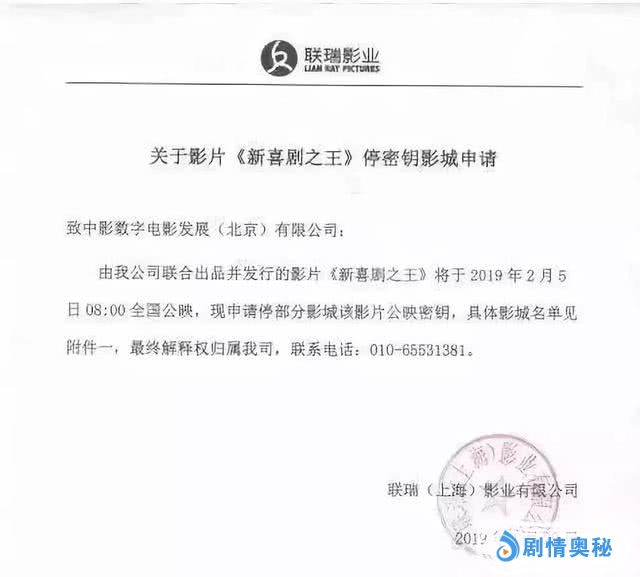 联瑞逼迫院线,不给排片就停密钥,不许放《新喜剧之王》。