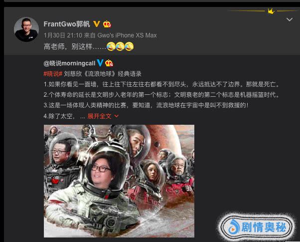 随后,《流浪地球》导演郭帆转发了这条微博并配字:“高老师,别这样……”