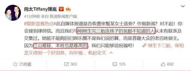 这不向太近日就炮轰了张柏芝:“江山难移,本姓也是难改的”还否认与她交集过“刚刚生完三胎连孩子的爸都不知道的人,从未有联系及交集过”。陈岚这个一看就是气话,当初是谁力捧张柏芝的?难道不是向家吗?当年两家可是好的穿一条裤子,当然张柏芝为人处事方面确实不敢恭维,向太炮轰她也没说错,张柏芝一手好牌打的稀巴烂太可惜了。