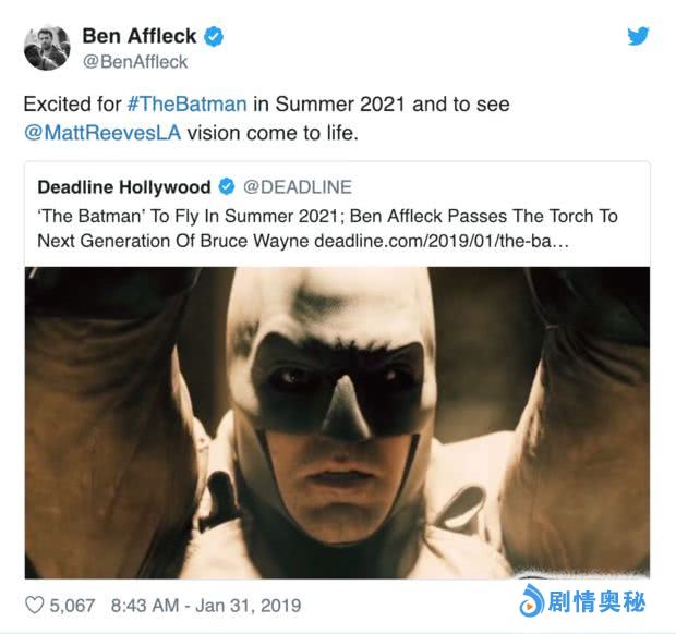 然而,让人意外的是本·阿弗莱克却正式公布了消息:不出演新作《蝙蝠侠》,将由一位更年轻的演员接替他出演蝙蝠侠,但具体是谁暂时未知。