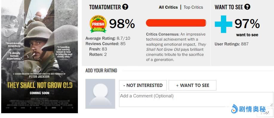 战争纪录《他们已不再变老》烂番茄几乎满分新鲜度高达98%,北美票房却仅收834万美元,你怎么看?你喜欢彼得·杰克逊哪部作品呢?《魔戒》《霍比特人》系列震撼到你了吗?欢迎讨论!
