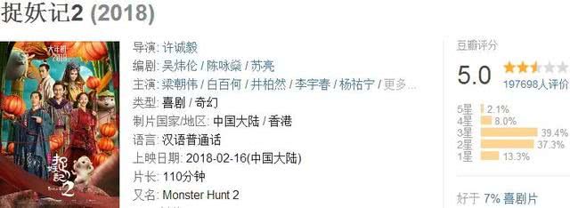 不过2018年春节档上映的《捉妖记2》口碑并不好,豆瓣只有5.0分,首日票房5.4亿,随后却开启了大跳水模式,最终票房只有22亿。可以说《捉妖记2》相当失败,相对于影片高达8亿的投资来说,不仅不赚钱还大亏一笔,非常尴尬。