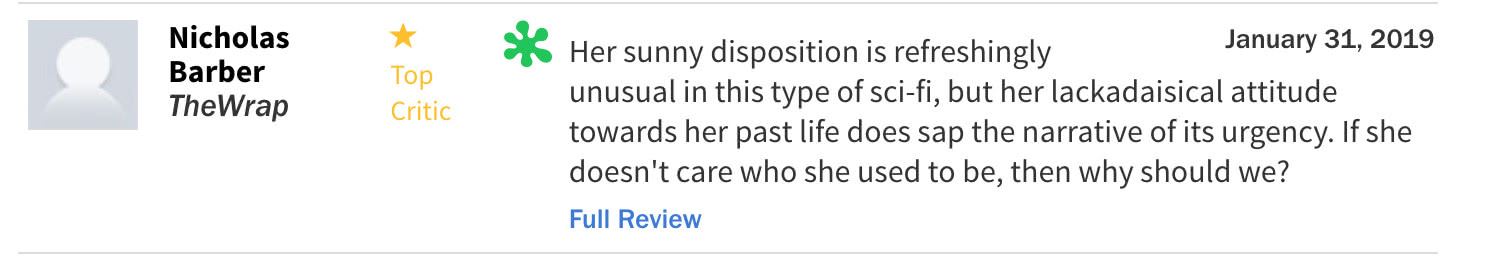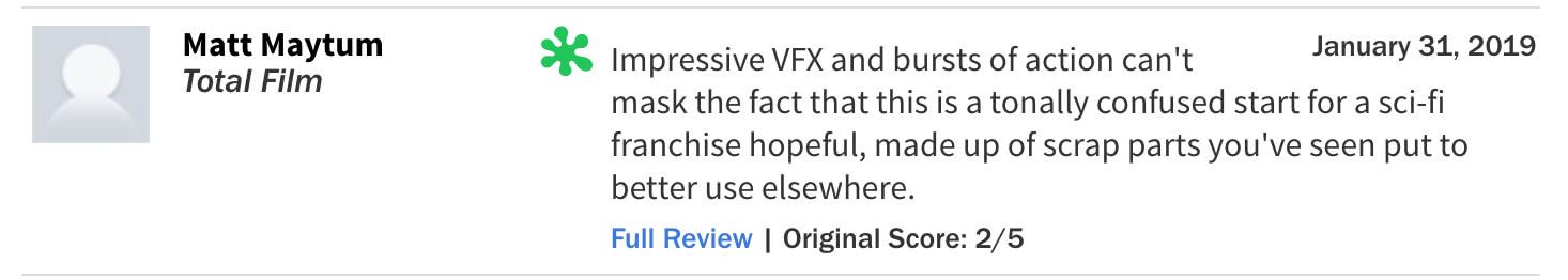 但同时也提出了这部电影的问题,对于故事的叙述有些混乱,使故事进行有些混乱。可能这也是《阿丽塔》解禁口碑不高的原因之一吧,目前烂番茄31%确实没有达到预期。