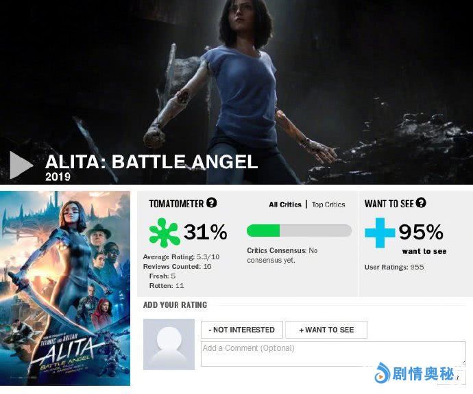 目前,《阿丽塔》口碑正式解禁!烂番茄的新鲜度为31%,16评中鲜评占5个,平均分为5.3,想看人数为95%。在MTC上评分为49分。