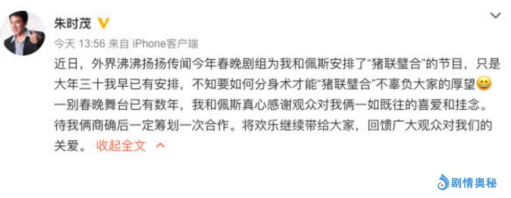 他说道“近日外界沸沸扬扬传闻今年春晚剧组为我和佩斯安排了‘猪联璧合’的节目,只是大年三十我早已有安排,不知要如何分身术才能‘猪联璧合’不辜负大家的厚望。一别春晚舞台已有数年,我和佩斯真心感谢观众对我俩一如既往的喜爱和挂念。待我俩商榷后一定筹划一次合作。将欢乐继续带给大家,回馈广大观众对我没的关爱”。