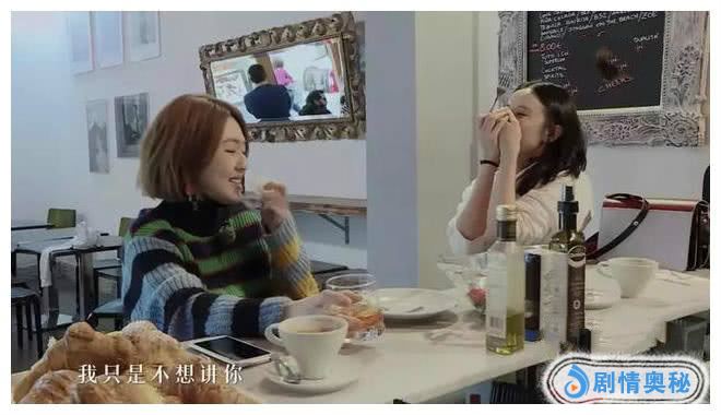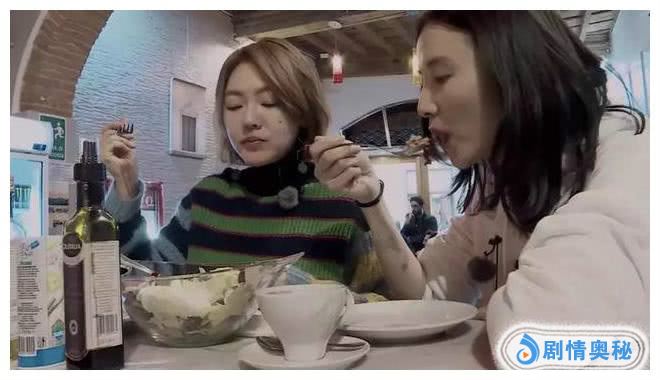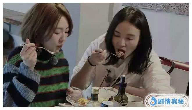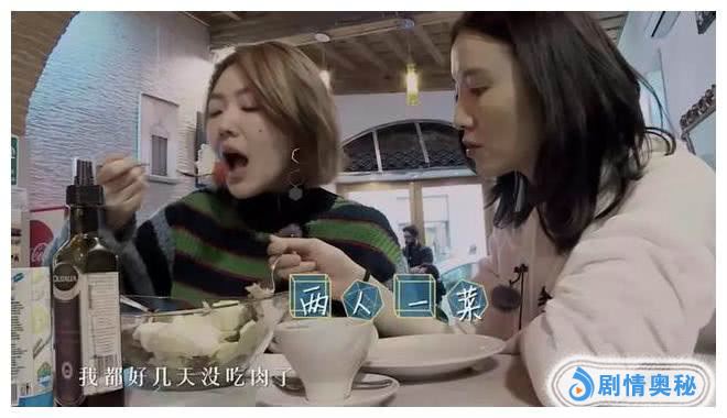 忙碌了一天的两个大姐坐下来准备吃一碗沙拉,做女明星真是可怜,肚子饿了也只能吃这种低热量又没味道的沙拉,沙拉中除了一些金枪鱼,剩下的全是水果蔬菜。沙拉一端上来,宋佳就拿出勺子果断地吃了一口金枪鱼。