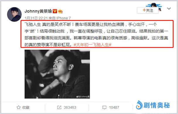 根据众多有幸参加影片《飞驰人生》的观众口中可以得知,影片故事非常简单,细节打磨没有像前两部拋得那么光。仍然有趣、阳光、热血大直男。而且相比韩寒之前的《后会无期》、《乘风破浪》来说,该片显得更加成熟,稳重影片质量上明显提高了一个档次。不仅如此,影片中剧情紧凑,人物丰满,前半段讲人生,后半段讲飞驰,更是勾起了影迷观影的心,而且观影之后更是大呼过瘾。