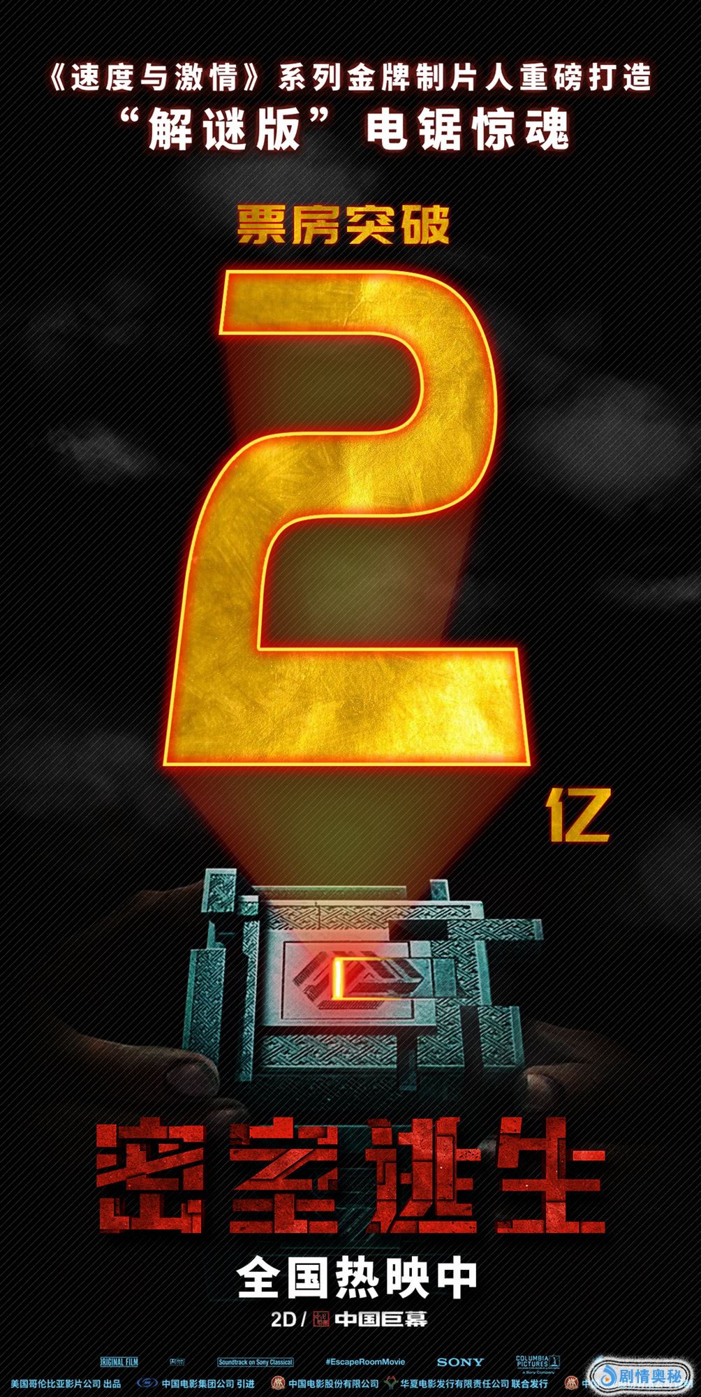 由美国哥伦比亚影片公司出品的好莱坞惊悚刺激大片《密室逃生》已上映两周时间,影片自映前便备受影迷关注,映后更是凭借过硬口碑在同档期新片中票房遥遥领先,上映两周后依然位列每日票房前五的位置,累计已经拿下2亿票房,被业内外人士评为“2019开年必看爽片”“密室禁闭电影新标杆”。