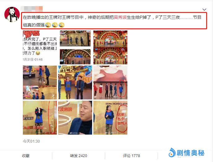 不仅如此,除了在电影、电视剧遭受抵制,由吴秀波参演的某电视台的春晚镜头也一度被后期删减,就连近期热播的综艺节目《王牌对王牌》中,吴秀波的镜头也一度被后期剪辑了,而负责后期剪辑的技术师更是一度吐槽到,为了剪辑这个镜头,硬是P了三天三夜。