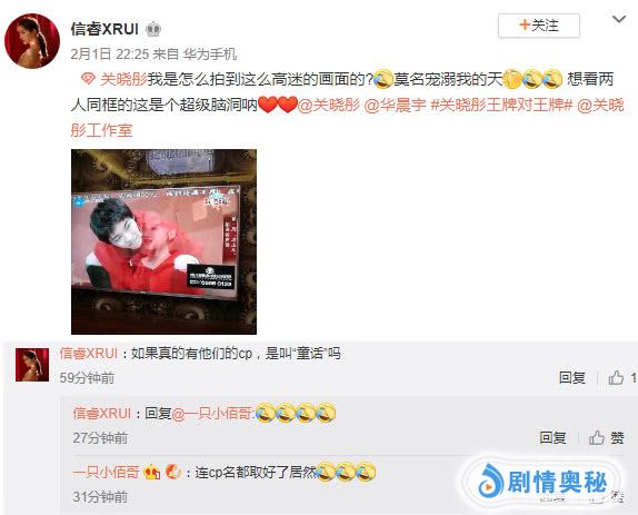 两人配合默契,也让一些小伙伴们想象了一幅美好的场景。尤其是在截到一张高迷的图片时(2月1日),小心思已经按藏不住要暴露了!“莫名宠溺我的天,想看两人同框的这是个超级脑洞呐!”可以看到,在切换画面的时候,华晨宇认真观察动静,和以及关晓彤呆萌望着的场景同框在了一起。迷之结合下就变成了花花一脸宠溺,关晓彤含羞。要说粉丝们的脑洞就是大。模糊的错位后,大家连两人的cp名都已经想好了。就叫童话cp。听上去是不是很甜美~