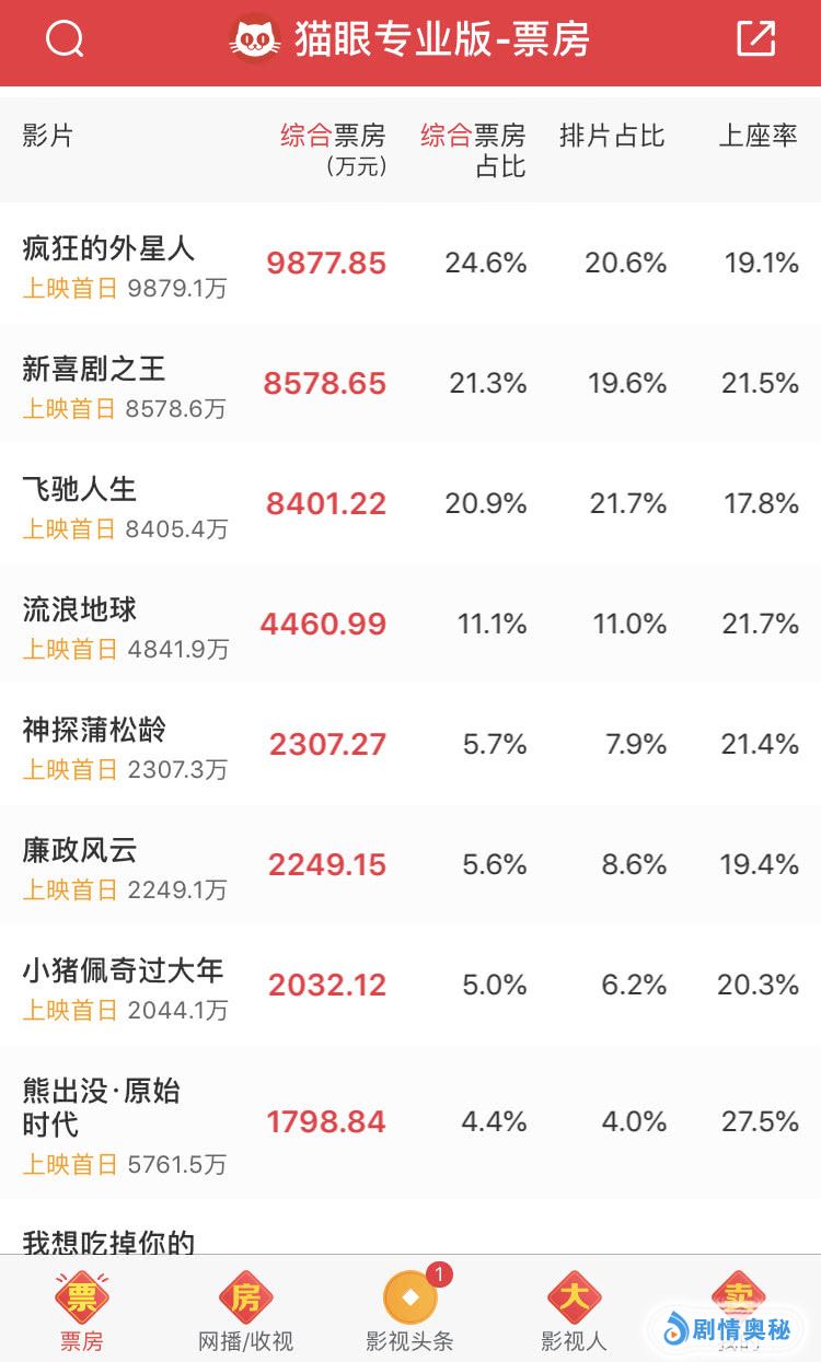 数据显示,大年初一预售票房排行里,《疯狂的外星人》以9800万票房领跑春节档,随后依次是《新喜剧之王》、《飞驰人生》、《流浪地球》、《神探蒲松龄》和《廉政风云》等。