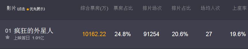 从大年初一的总体预售票房数据来看,电影《疯狂的外星人》以破1亿的预售票房强势的夺得了第一的宝座。虽然从目前的情况来看,《疯狂的外星人》不管是在上座率还是排片都不是第一,但是总体来看也并不低,所以绝对是有很大希望夺得大年初一这一天的票房冠军宝座。