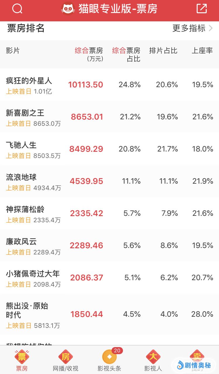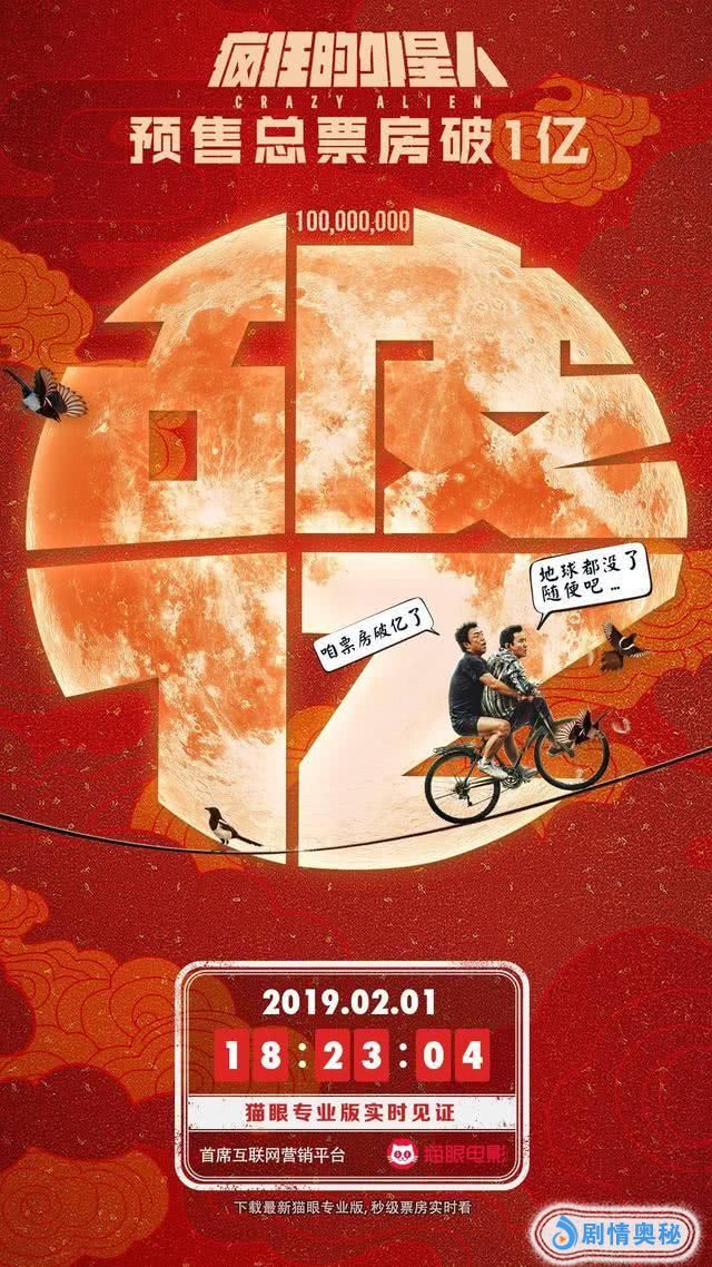根据猫眼专业版数据,截止至2月2日晚,万众瞩目的春节档电影《疯狂的外星人》大年初一预售票房正式突破1亿!