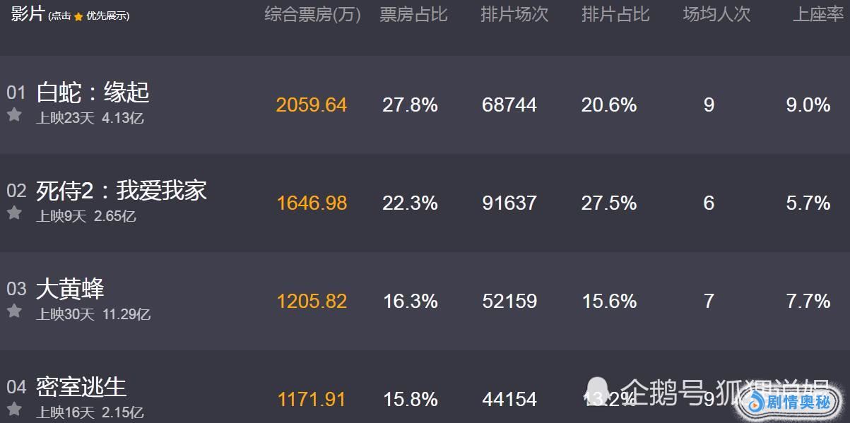 《白蛇:缘起》刚开局票房不强,院线排的场次也不多,期间还陆续受到国产大片和进口大片的冲击,可是最后它都挺过来了。目前实时2059万(截止22点46),上映23天累计4.13亿元,这个成绩是史上最卖座国产动画片之一。在很多国人思维中动画片就是小朋友看的,可是这部片却冲破了这个界限,它赢得了很多大人观众的支持。