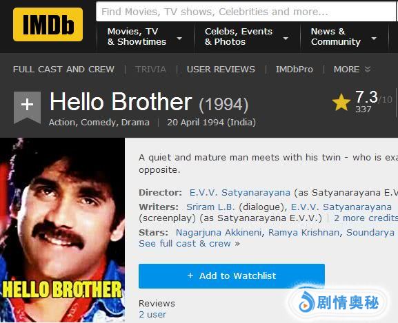 1994年,在港版《双龙会》上映2年后,印度就倒腾出了翻拍版的《Hello Brother》。