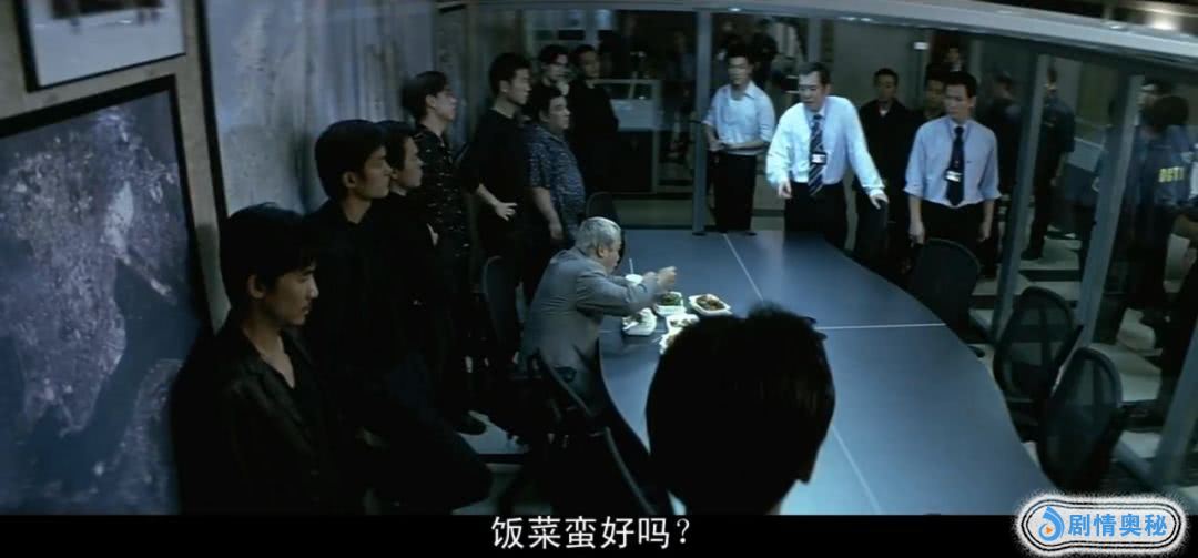 这让我想到了《无间道》的一场戏,黑帮老大琛哥被请到警局“协助调查”,他一边吃盒饭,一边与黄警官对峙…