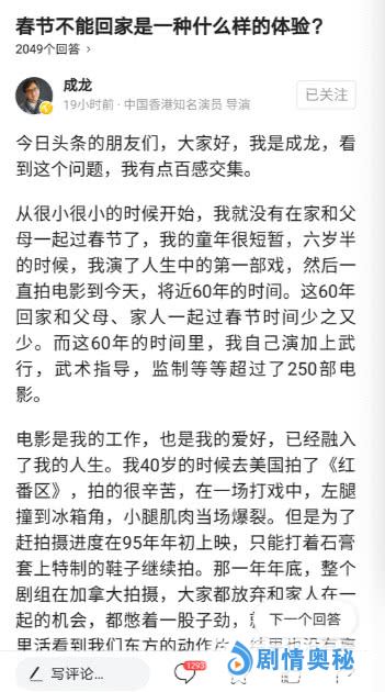 说到这,不得不提起成龙,虽然已经64岁,从影58年,拍了几百部电影,他仍然奋斗在影视一线,拍出精彩的电影,带给大家超凡的观影体验。他敬业,努力,教会我们勇敢面对困难,充满正能量和正义感。说起春节,这么多年来,成龙说,即使牺牲了自己过年陪伴父母的时间,也想多拍一些电影,实在是令人感动!
