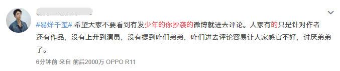 不过还是有粉丝很理智的,微博也在劝人“希望大家不要看到有《少年的你》抄袭的微博就进去评论,人家有的只是针对作者还有作品,没有上升到演员,没有提到咱们弟弟。”