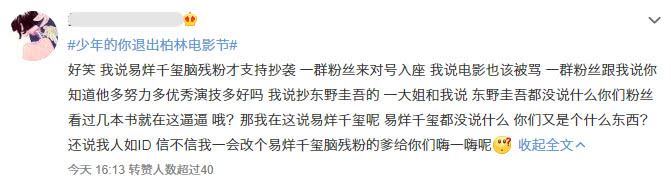 片方根本不理会这些言论,电影该怎么上怎么上,易烊千玺的有些粉丝也开始围攻爆料“抄袭”的博主,开始洗地,该博主称“好笑,我说易烊千玺脑残粉才支持抄袭,一群粉丝来对号入座,我说电影也该被骂,一群粉丝跟我说你知道他多努力多优秀演技多好吗? ”