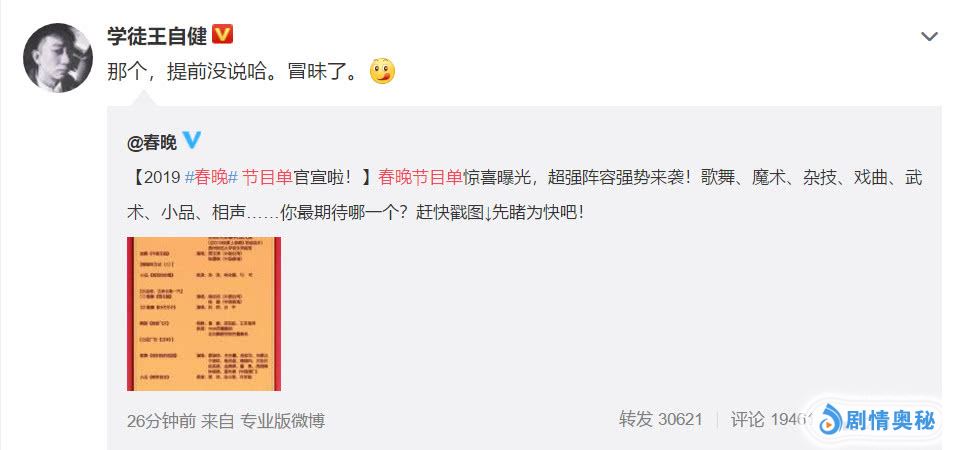 这次王自健非常低调,直到节目单公布,很多人才知道。粉丝留言说:哇你不说我都没发现还有小王爷。王自健保密工作做得太好了。
