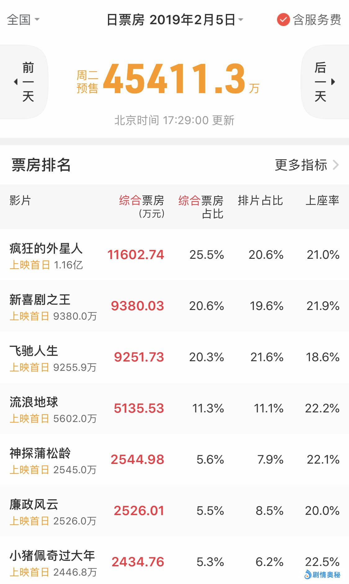 先来看一下这几部国产新片的预售票房成绩,《疯狂的外星人》首日预售票房为1.1亿;《新喜剧之王》首日预售9300万;《飞驰人生》预售票房9100万;《流浪地球》预售票房5600万;《神探蒲松龄》预售票房2500万;《廉政风云》预售票房2500万,《小猪佩奇过大年》预售票房2400万。